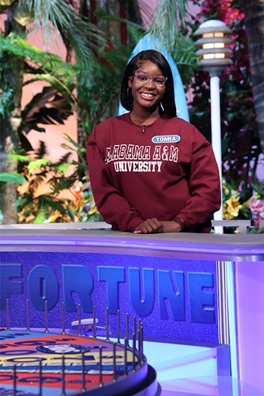 Tomia Gordon, a junior communications media major from Phenix City, Alabama, was a contestant on the Wednesday, April 5, “Wheel of Fortune” College Week.